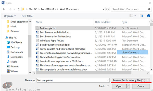 ۱۰.حال فایل متنی آسیب دیده را انتخاب کرده و بر روی Open کلیک کنید.