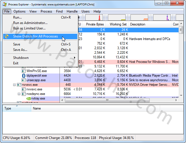 شما میتوانید یک فایل را با process Explorer ( دانلود process Explorer ) به خوبی از قفل شدن خارج کنید.قبلا به شما در مورد پردازش و نحوه ی کار اکسپلورر گفته ایم اما اکنون میخواهیم به شما چگونگی حذف کردن و یا باز کردن یک فایلی که قفل شده است را یاد بدهیم. شما نیازی به نصب هیچ برنامه اضافه ای ندارید و این برنامه بدون فرایند پیچیده نصب براحتی اجرا میشود. برای اجرای این برنامه کافیست. از طریق دسترسی مدیریت یا administrator اقدام کنید. در واقع شما برای انجام اینکار پس از باز کردن برنامه به منوی File مراجعه میکنید و گزینه “Show Details for All Processes” را انتخاب میکنید.