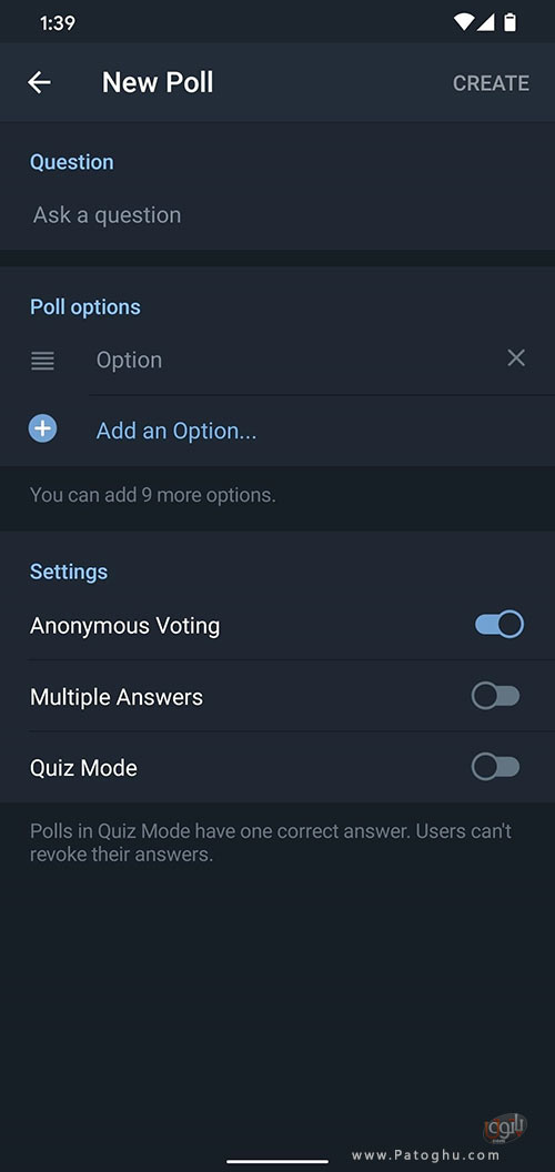 4. زیر گزینه ی Poll Options گزینه های مختلفی را که می خواهید اعضای گروه به آن رای بدهند را وارد کنید. بدین منظور هر بار که می خواهید گزینه ی جدیدی اضافه کنید بر روی add an option… ضربه بزنید.